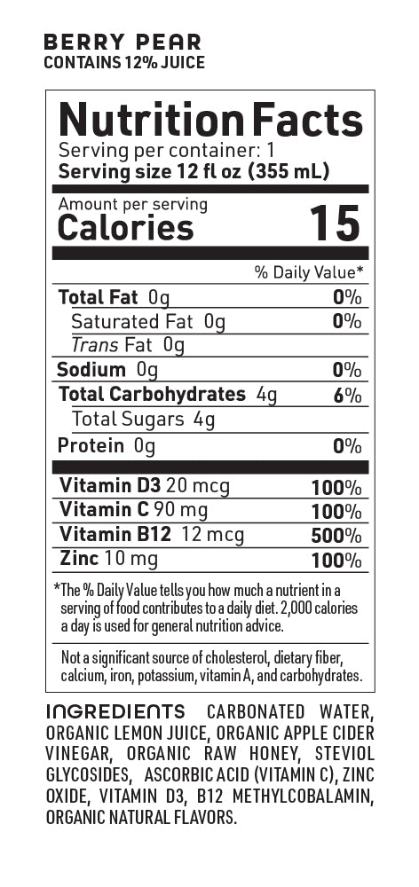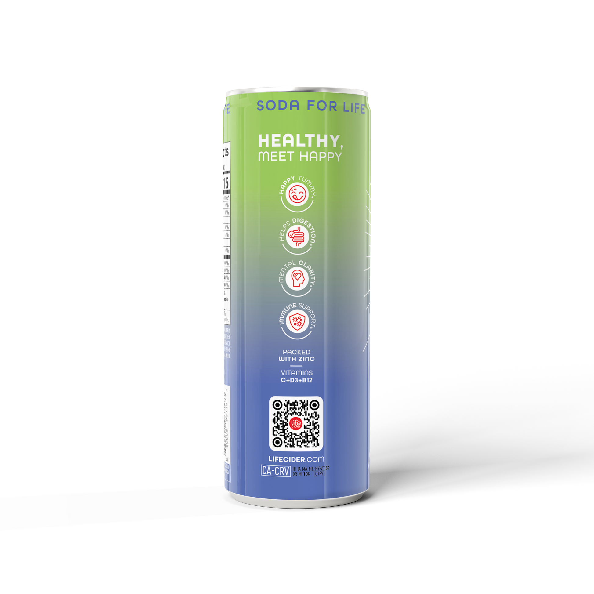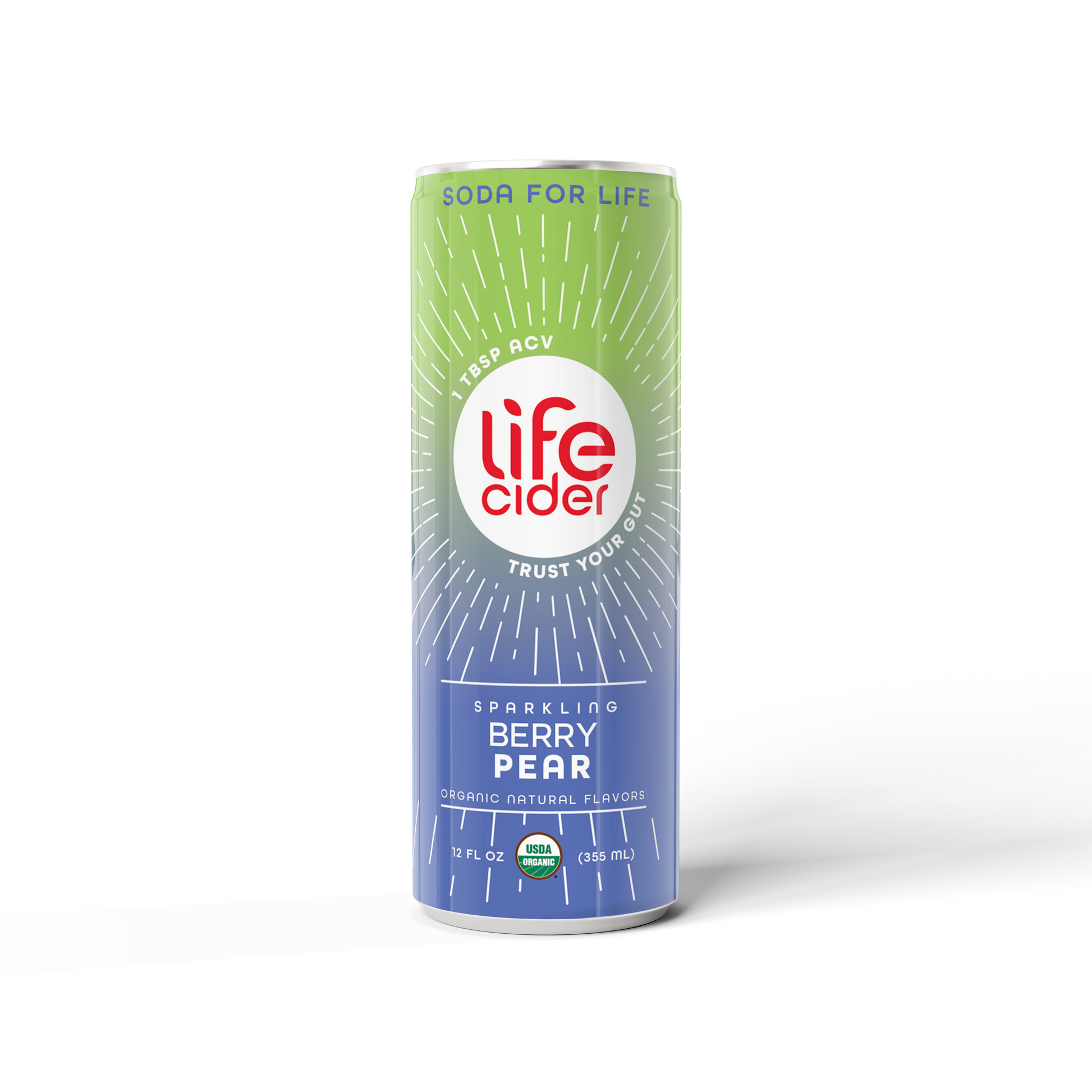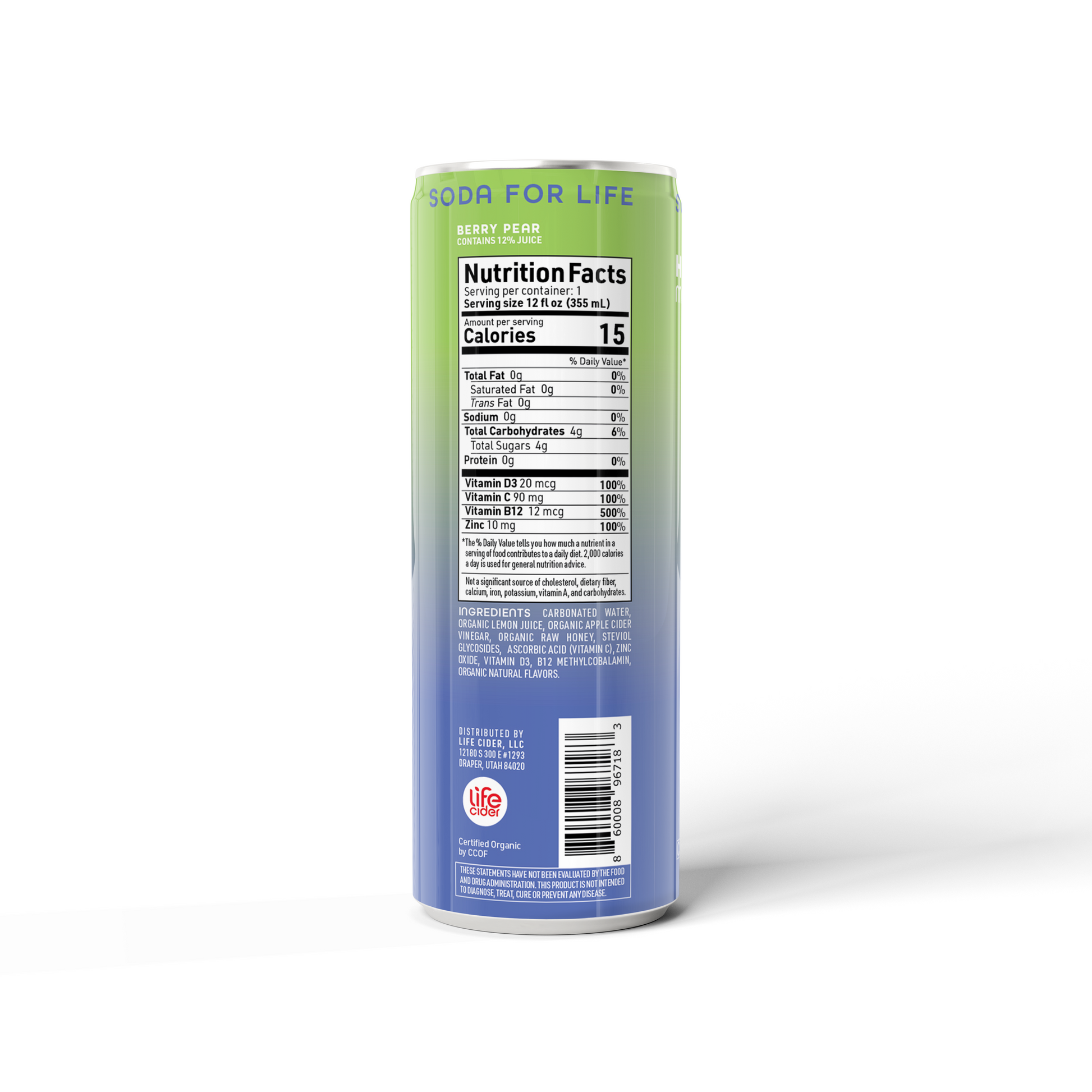 Life Cider Original certified organic sparkling soda. Our new Berry Pear formula now has only 15 calories & 4 carbs! Every can contains 1 full tbsp of organic ACV and immune-boosting vitamins. The most delicious way to take 100% of your daily allowance of Vitamin C, Vitamin D, and Zinc. Plus, 500% daily allowance of methylated B12 for a natural energy boost and mental clarity. Healthy, meet Happy.