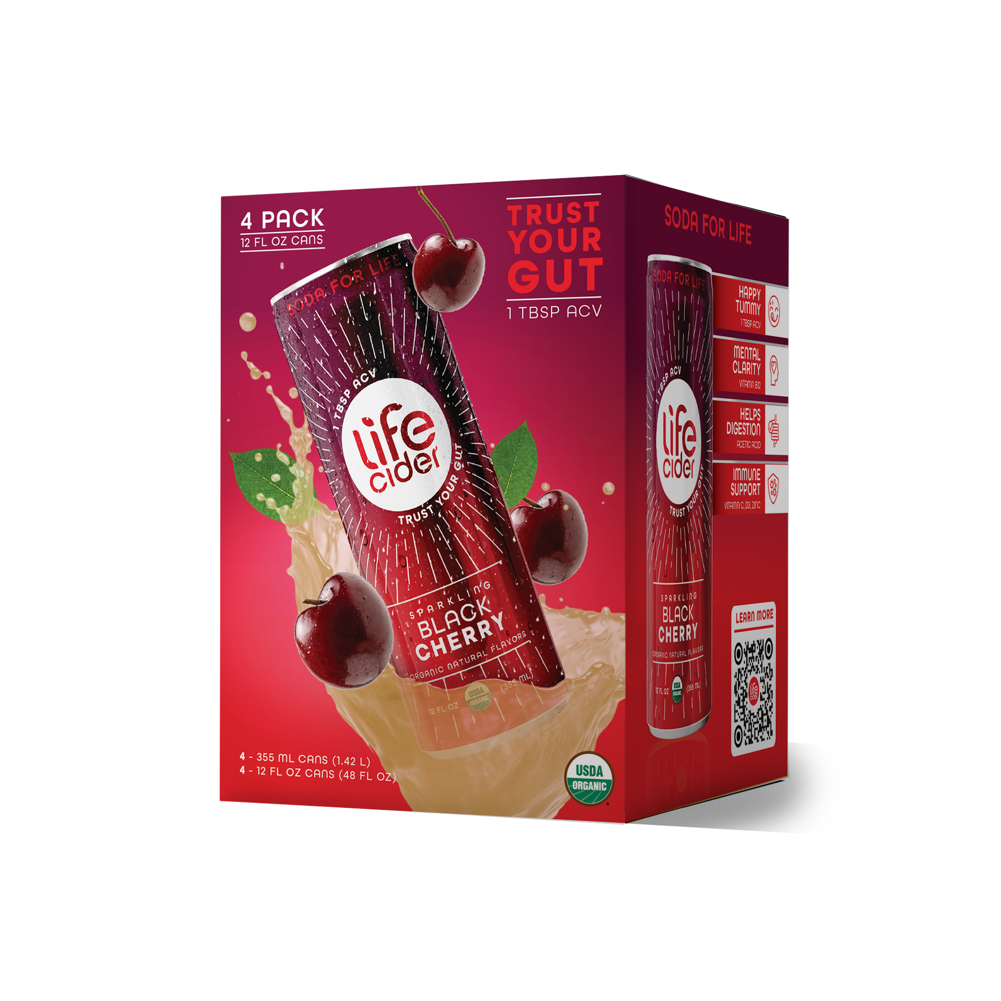 Life Cider Original Certified Organic sparkling soda 4-pack. Our new Black Cherry formula now has only 15 calories & 4 carbs! Every can still contains 1 full tbsp of organic ACV and immune-boosting vitamins. The most delicious way to take 100% of your daily allowance of Vitamin C, Vitamin D, and Zinc. Plus, 500% daily allowance of methylated B12 for a natural energy boost and mental clarity. Healthy, meet Happy.